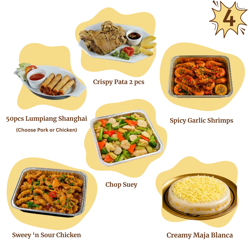 Package 4 is a complete celebration feast designed for families, birthdays, meetings, and special gatherings. Enjoy the rich flavors of Filipino favorites starting with tender Sweet ‘n Sour Chicken, two perfectly cooked Crispy Pata, and mouth-watering Spicy Garlic Shrimps sautéed to perfection. Add freshness to the menu with Chop Suey Special, then delight guests with golden Lumpiang Shanghai—available in pork or chicken. Finish with a smooth, velvety Creamy Maja Blanca for the perfect Filipino dessert experience.