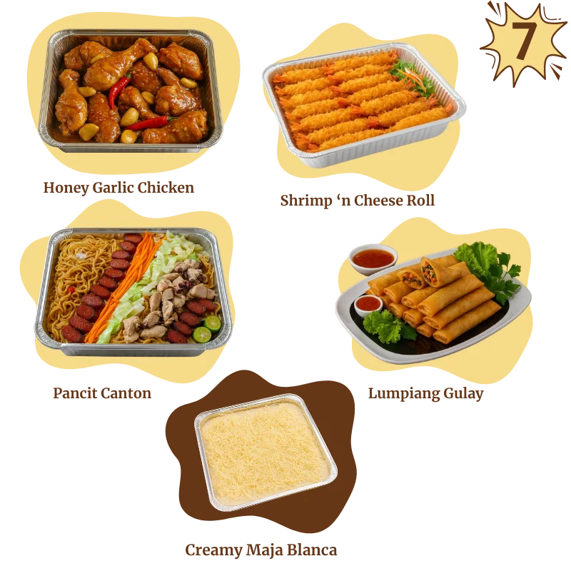Package 7 offers a delicious mix of sweet, savory, and festive Filipino flavors. Enjoy tender Honey Garlic Chicken, crispy and creamy Shrimp and Cheese Rolls, and flavorful Special Pancit Canton Guisado, a staple for celebrations. Add a healthy crunch with freshly made Lumpiang Gulay, and complete the menu with the smooth, milky goodness of Creamy Maja Blanca.